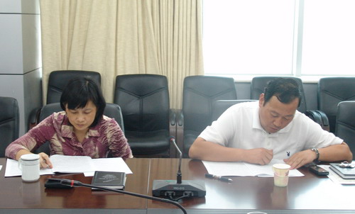 图2党委书记何洁文(左)罗业凤总经理(右)在认真地学习十七大报告