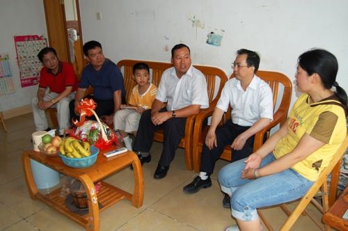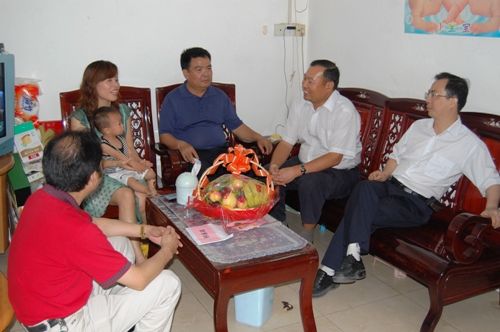 图为罗业凤总经理等领导在员工龙如演家中看望其家属并与之亲切交谈