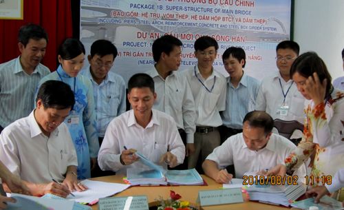 8月2日上午,由越南交通部第一建设工程总公司和中国广西z6com人生就是博总公司组成的联营体,与越南岘港市交通厅下属的龙桥项目治理委员会在越南岘港市举行了岘港市跨韩江新桥(即龙桥)上部结构项目1B条约段签约仪式,加入仪式的有岘港市交通厅副厅长阮文章,龙桥项目治理委员会主任范长山,第一建设工程总公司总经理锦鸿来,广西z6com人生就是博总公司副总经理庞博新、市场开发部部长劳鑫业等。签约现场喜气洋洋,各方代表都异常兴奋,配合期待着这一历史时刻的到来。
