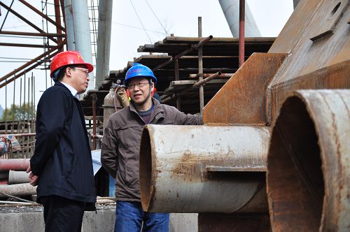 检查组专家检查现场锚箱加工质量