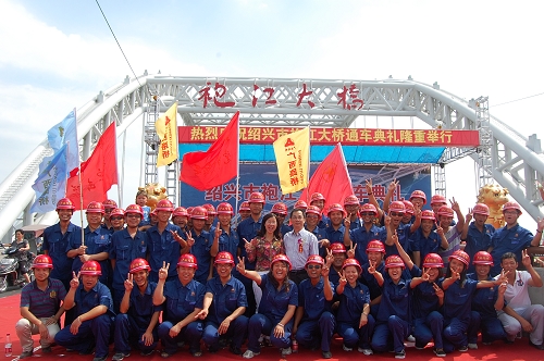 2008年8月,我们怀着无比自豪的心情,加入了袍江大桥的建设,三年的建设中,袍江大桥也在浙江桥梁建设史上创下了三项“首次”:首次在绍兴桥梁项目中接纳钢板桩围堰工艺及旋挖转机设备,乐成克服曹娥江特殊软土地质桥梁施工难题;首次在海内同类型的桥梁中接纳单肋合拢施工工艺,袍江大桥缆索吊装系统跨径抵达718米,塔高抵达120米,再次刷新了浙江省无支架缆索吊装施工的新纪录;首次接纳海内同类桥型中长度最长的系杆,袍江大桥超长系杆总长640米,整体施工技术控制难度大、控制精度高。同时,袍江大桥还荣获了全国工人先锋号、全国工程建设优秀质量治理小组、省部级优秀QC运动结果一等奖等一系列荣誉称呼。