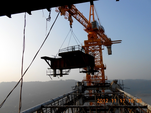 - 11月17日,泸渝2标顺利完成首次扣塔拆除作业,此次拆除部位为重庆岸扣塔下游侧扣塔顶支承万能杆件的构件,拆除构件重约38.8吨,同时,宣告“世界第一跨”波司登大桥无支架缆索吊装系统即将退出施工舞台。