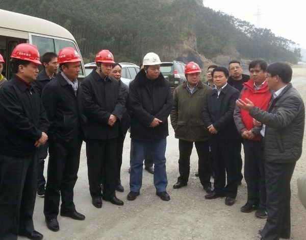 213上午,河池市委书记黄世勇、广西交投集团董事长余昌文等领导一行到河都路面A标进行调研,长长公司董事长王锋也对项目节后复工等事情进行了检查指导 。